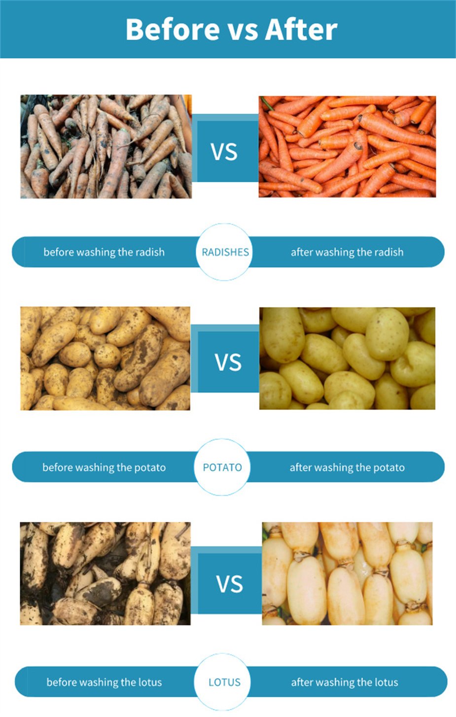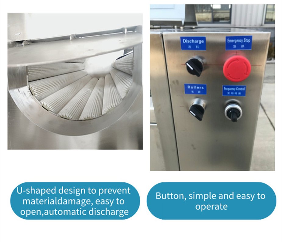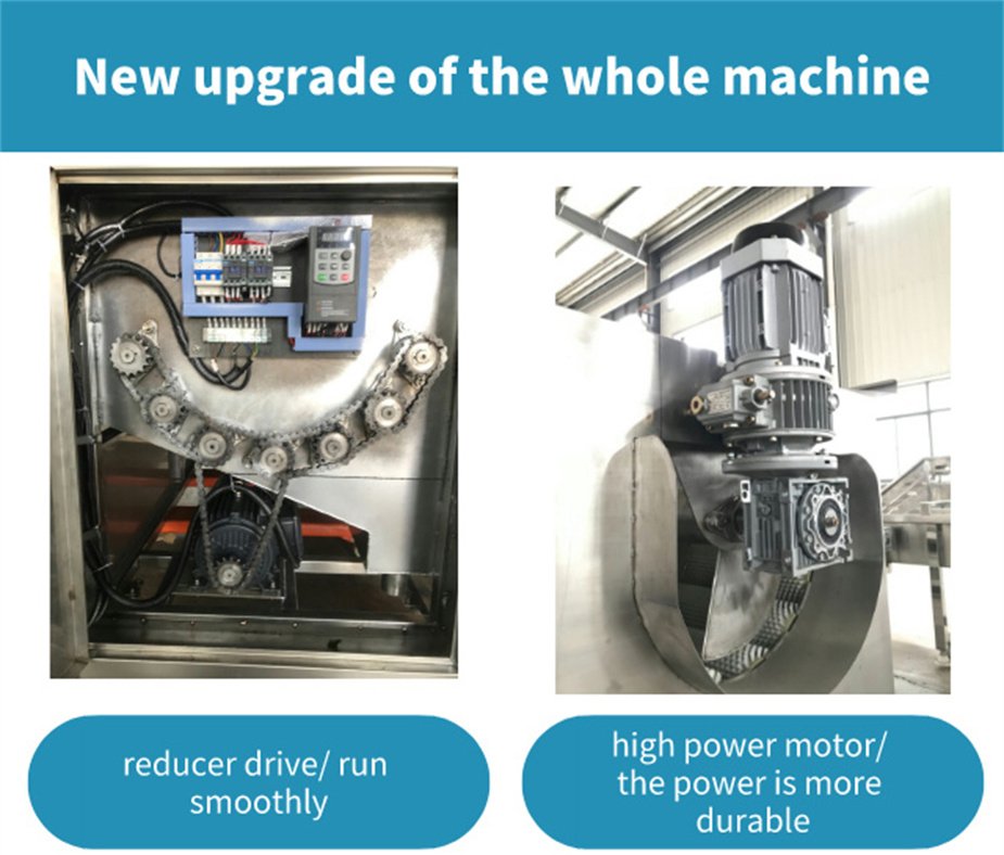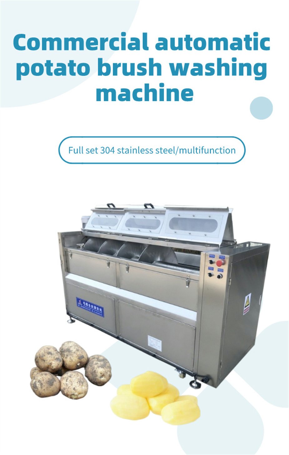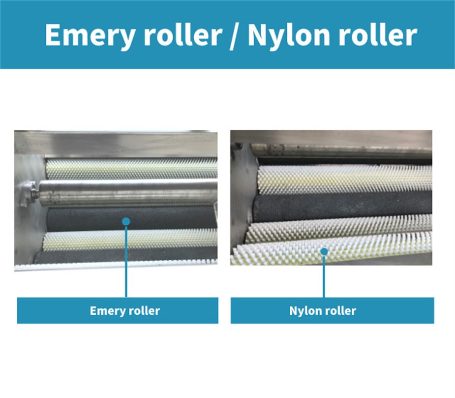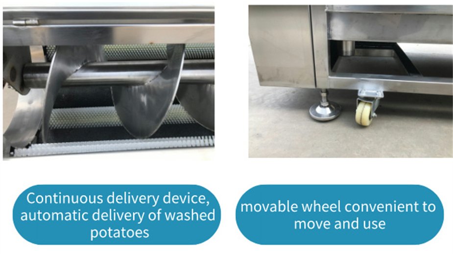 Cleaning and peeling machine, the main working principle is that the motor drives the chain to rotate, and the chain is driven to the roller, so that the roller rotates at high speed. Potato, white gourd, ginger, potatoes, sweet potatoes, kiwi fruit, all kinds of radish and taro roots like fruits and vegetables, and so on to the mud and peeled need to be peeled and cleaned are rotated in the peeling tank with the rotation of the hair roller, and the brush on the hair roller is scraped to remove the skin of the cleaning object, and the high pressure spray head is sprayed above. Make the items get a large degree of cleaning.