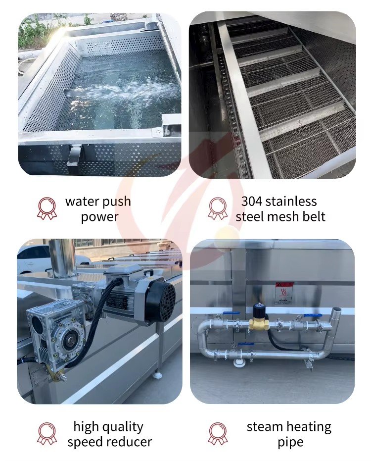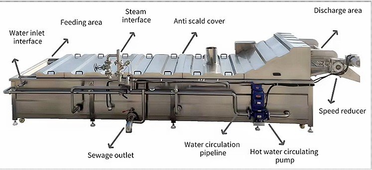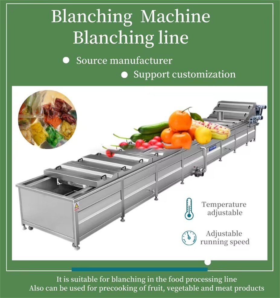 Blanching machines are primarily used for processing vegetables, fruits, petals, meat products, and seafood. They provide color-preserving precooking. The water inside the blanching machine is hot water, heated electrically or by steam. The machine offers uniform temperature and a high degree of automation, making it an essential piece of equipment for food processing.