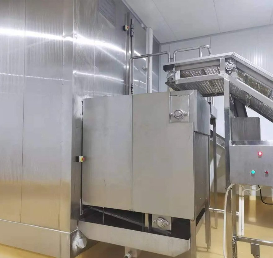 7. The enclosure door is double-sealed and equipped with an electric heater, allowing it to be opened at any time to prevent freezing and sticking. 8. The conveyor belt is equipped with water cleaning nozzles that can be opened during use to ensure food hygiene. A 304 stainless steel high-pressure fan blows away water droplets, ensuring they do not affect product freezing.