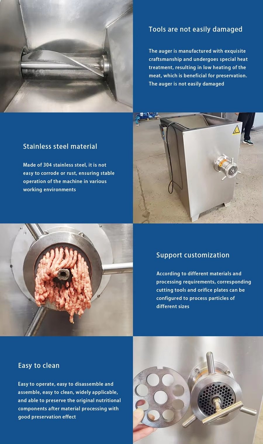 A meat grinder is a highly efficient pre-processing machine designed specifically for modern food processing plants. It is suitable for mincing all types of fresh meat, frozen meat, poultry, and by-products. Its core value lies in its stable mechanical performance and precise cutting control, significantly improving minced meat quality and production efficiency. It is an ideal choice for producing products such as sausages, ham, meatballs, stuffings, and prepared dishes.