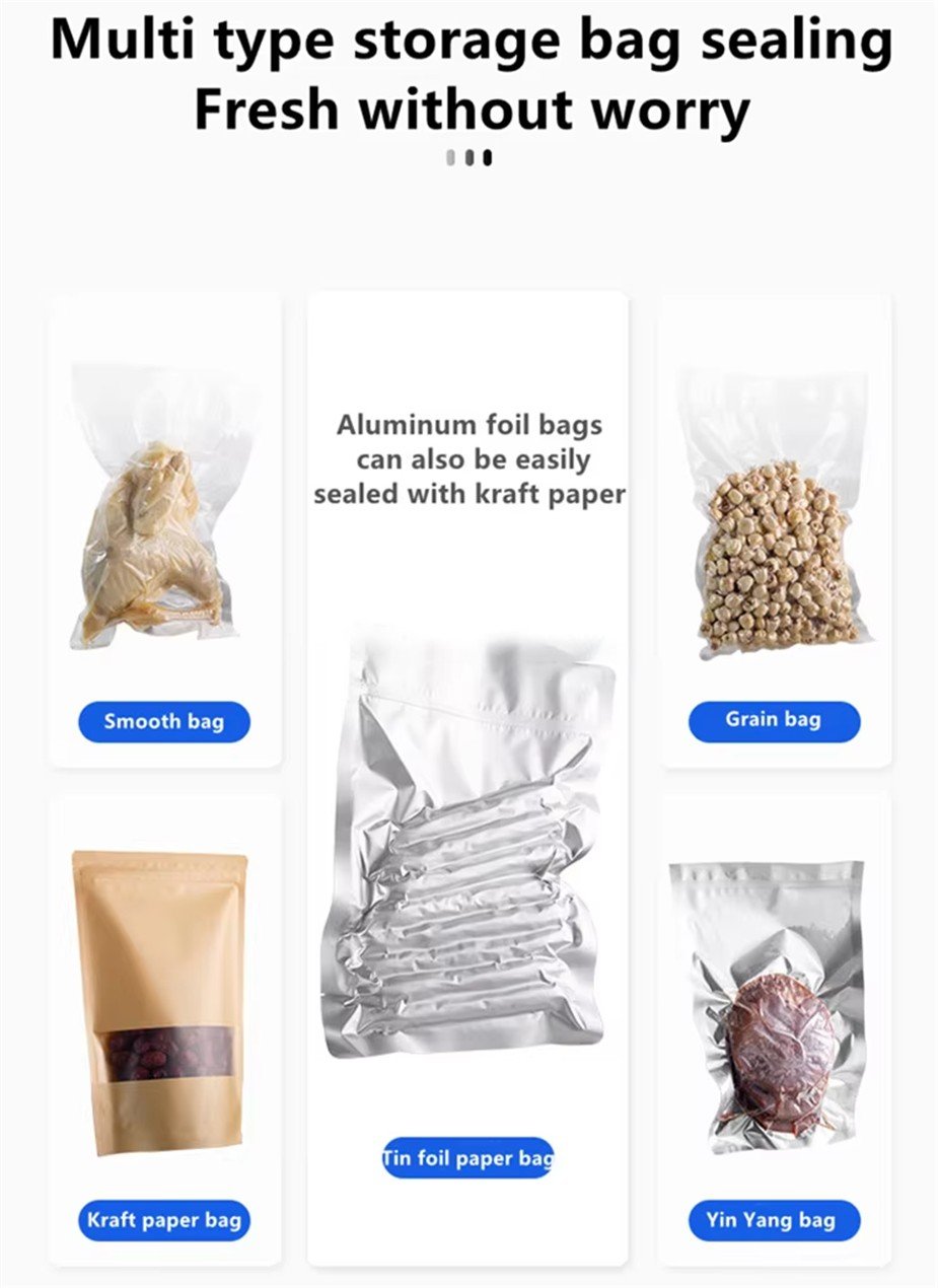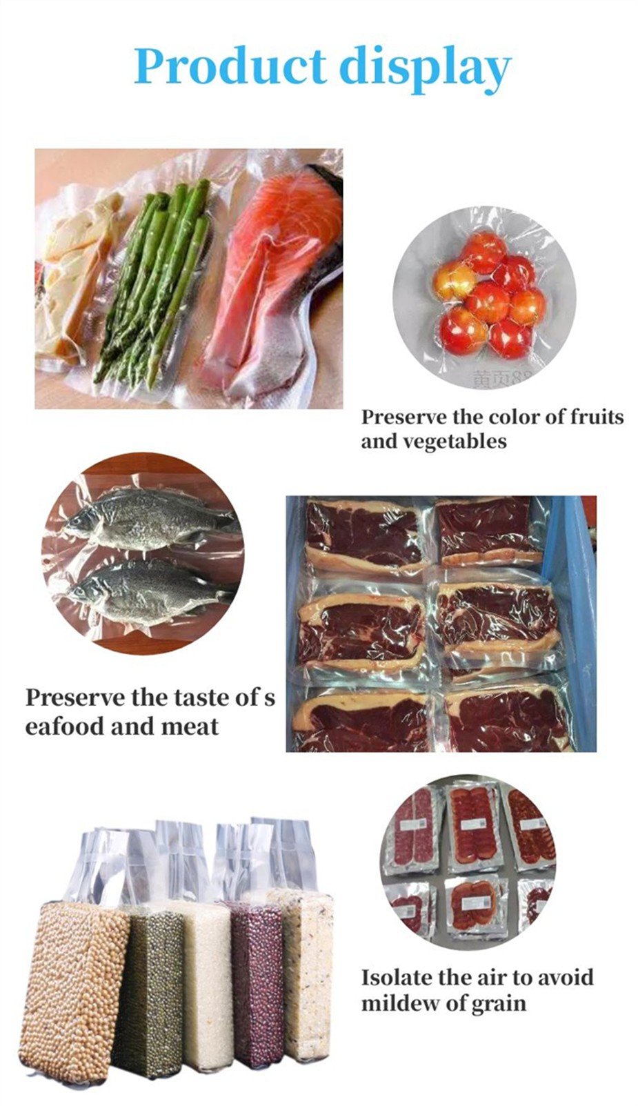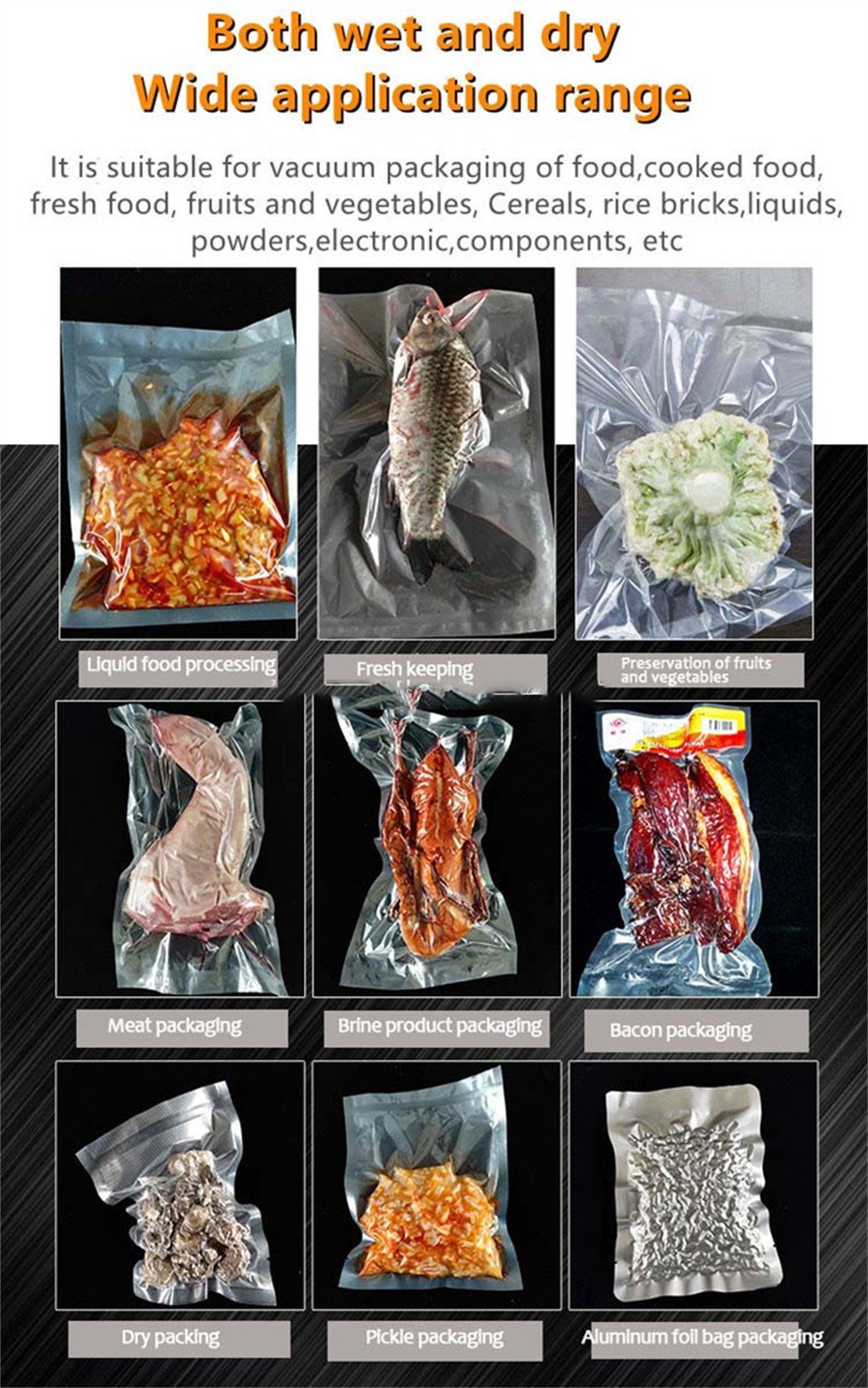 Suitable for both dry and wet use, multifunctional and multi-purpose, dry goods, raw and cooked (meat), seafood, fruits and vegetables, grains, tea, etc. can be vacuum packed.