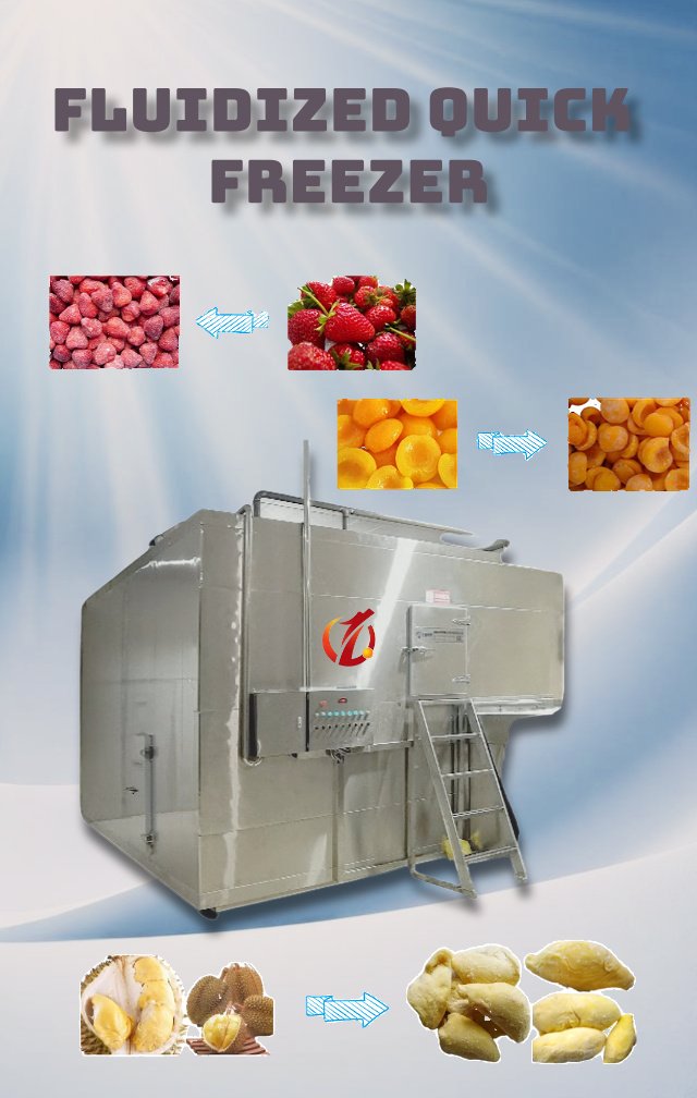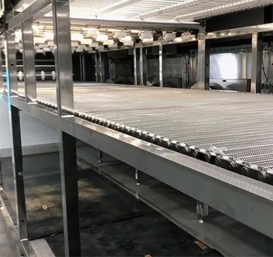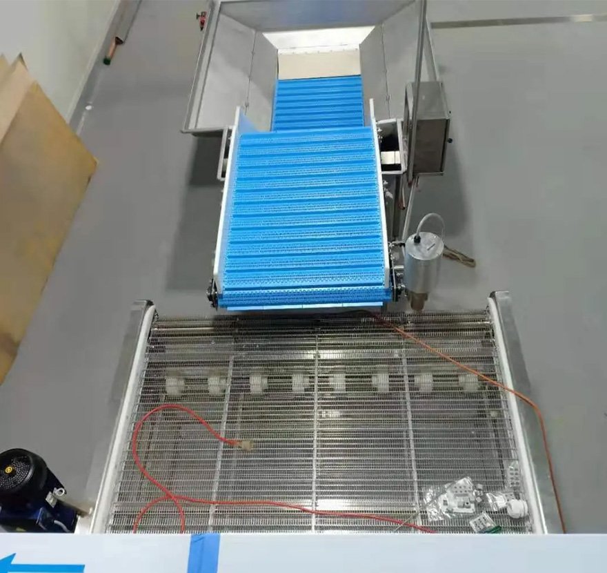 11. The front and rear sections of the mesh belt are equipped with variable frequency vibrating rollers to prevent product sticking. The mesh belt also provides excellent ventilation to ensure that frozen products do not get stuck.